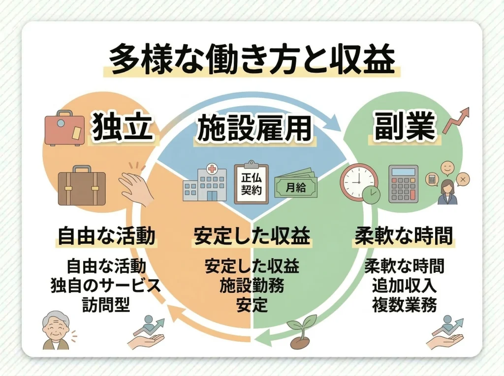施設雇用なら月給制で安定を取りやすく、業務委託や副業なら件数次第で上振れも下振れもあります。